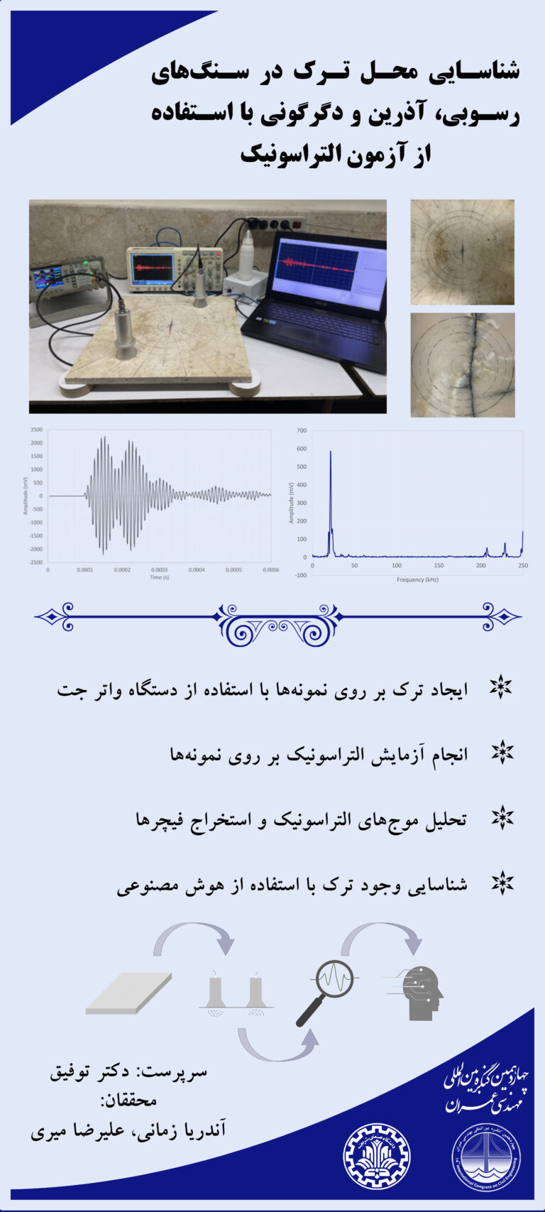 This project focuses on identifying crack locations in sedimentary, igneous, and metamorphic rocks using advanced ultrasonic testing. The process involves creating precise cracks using water jet technology, followed by ultrasonic wave analysis to extract key features. By integrating Artificial Intelligence, the system can accurately detect the presence and location of structural defects.