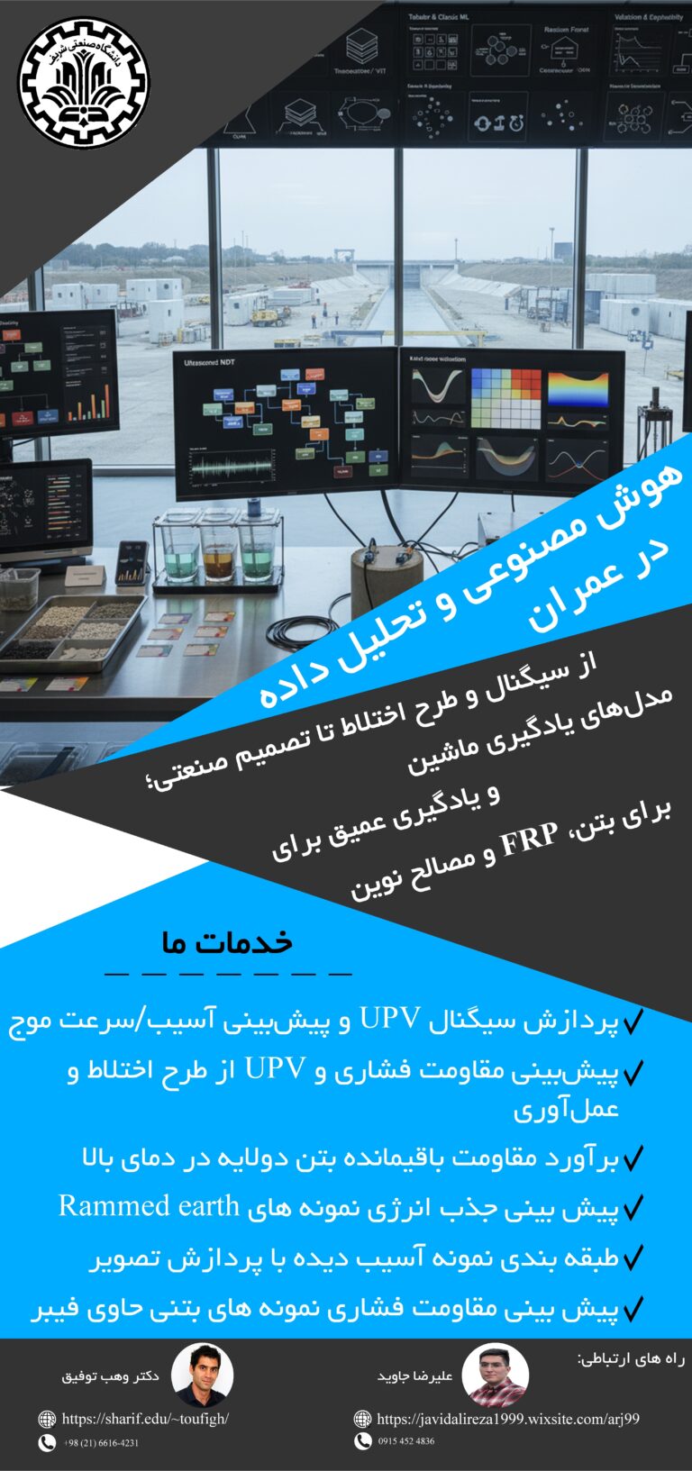 Artificial Intelligence is revolutionizing concrete technology by analyzing thousands of experimental data points to improve the accuracy of strength and workability predictions. Our services include UPV signal processing for damage prediction, automated mix design optimization to minimize waste, and long-term durability forecasting under various environmental conditions.