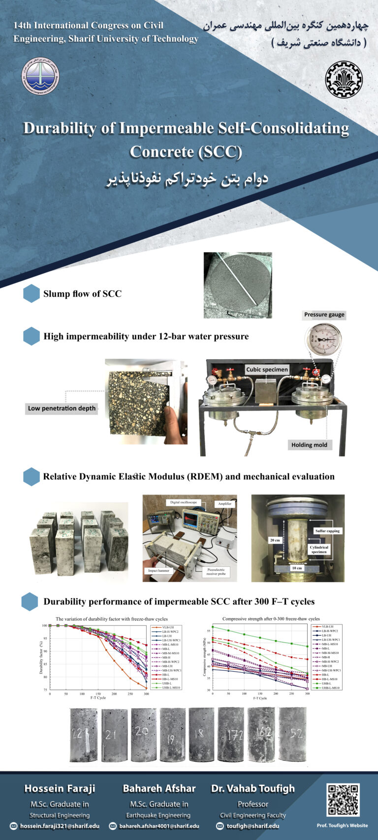 This research evaluates the high impermeability of SCC under 12-bar water pressure and its long-term durability after 300 freeze-thaw cycles. Through the assessment of Relative Dynamic Elastic Modulus (RDEM) and mechanical properties, we ensure the stability and low penetration depth of concrete specimens in extreme environmental conditions.